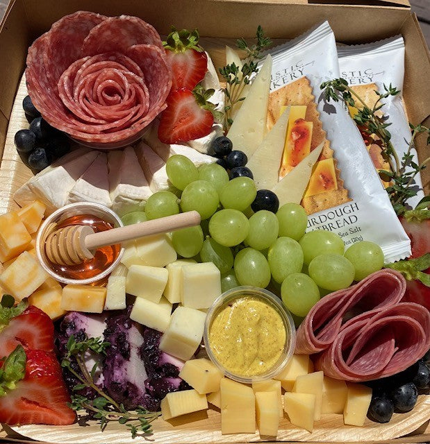 Serves 2-3 - 4 cheeses, 2 meats, fruit, almonds, mustard, honey, crackers on the side.